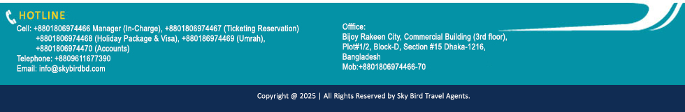 Our Headquarters are in the RAK Tower, located in Uttara the bustling satellite town of Dhaka Metropolis, which accommodates most of our business houses like RAK Ceramics (Bangladesh) Ltd., Rakeen Development Company (BD) Ltd, Julphar Bangladesh Ltd., RAK Paints Pvt. Ltd., RAK Capital Limited, Green Planet Communications Pvt. Ltd. And we are Sky Bird Travel Agents (Pvt.) Limited a proud partner of this Giant Conglomerate.